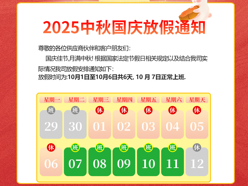 尊敬的各位供應(yīng)商伙伴和客戶朋友們:國(guó)慶佳節(jié),月滿中秋!國(guó)慶家園月圓人團(tuán)園,國(guó)慶中秋雙節(jié)共歡騰!在此預(yù)祝大家度過(guò)一個(gè)輕松、愉快的假期.根據(jù)國(guó)家法定節(jié)假日相關(guān)規(guī)定,再結(jié)合我司實(shí)際情況,現(xiàn)將2025年國(guó)慶中秋節(jié)放假安排通知如下:放假時(shí)間定為10月1日至10月6日(星期三至星期一),共計(jì)6天.2025年 10月 7日(星期二)正式上班,假日期間如有業(yè)務(wù)需求可電話咨詢(xún)業(yè)務(wù),感謝大家的理解與配合!秋高氣爽迎中
